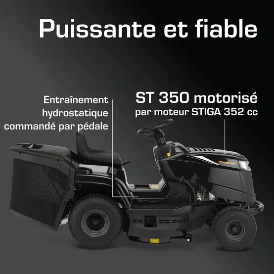 Équipé d’un moteur STIGA ST 350 352 cm³ délivrant environ 6,5 kW (≈ 8,8 CV), réputé pour sa fiabilité et son silence. Le démarrage se fait par clé électrique ; l’embrayage électromagnétique active les lames facilement, pour une tonte précise dès que vous appuyez sur le bouton.