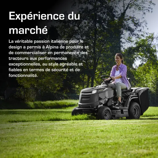 - Volant ergonomique et siège Alpina Smart avec soutien lombaire pour une tonte confortable.