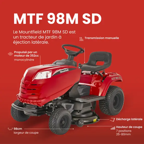 Puissant, simple à entretenir et taillé pour les grandes surfaces, le Mountfield MTF 98M SD est un tracteur tondeuse à éjection latérale parfaitement adapté aux besoins des particuliers souhaitant gagner du temps et obtenir une tonte impeccable.